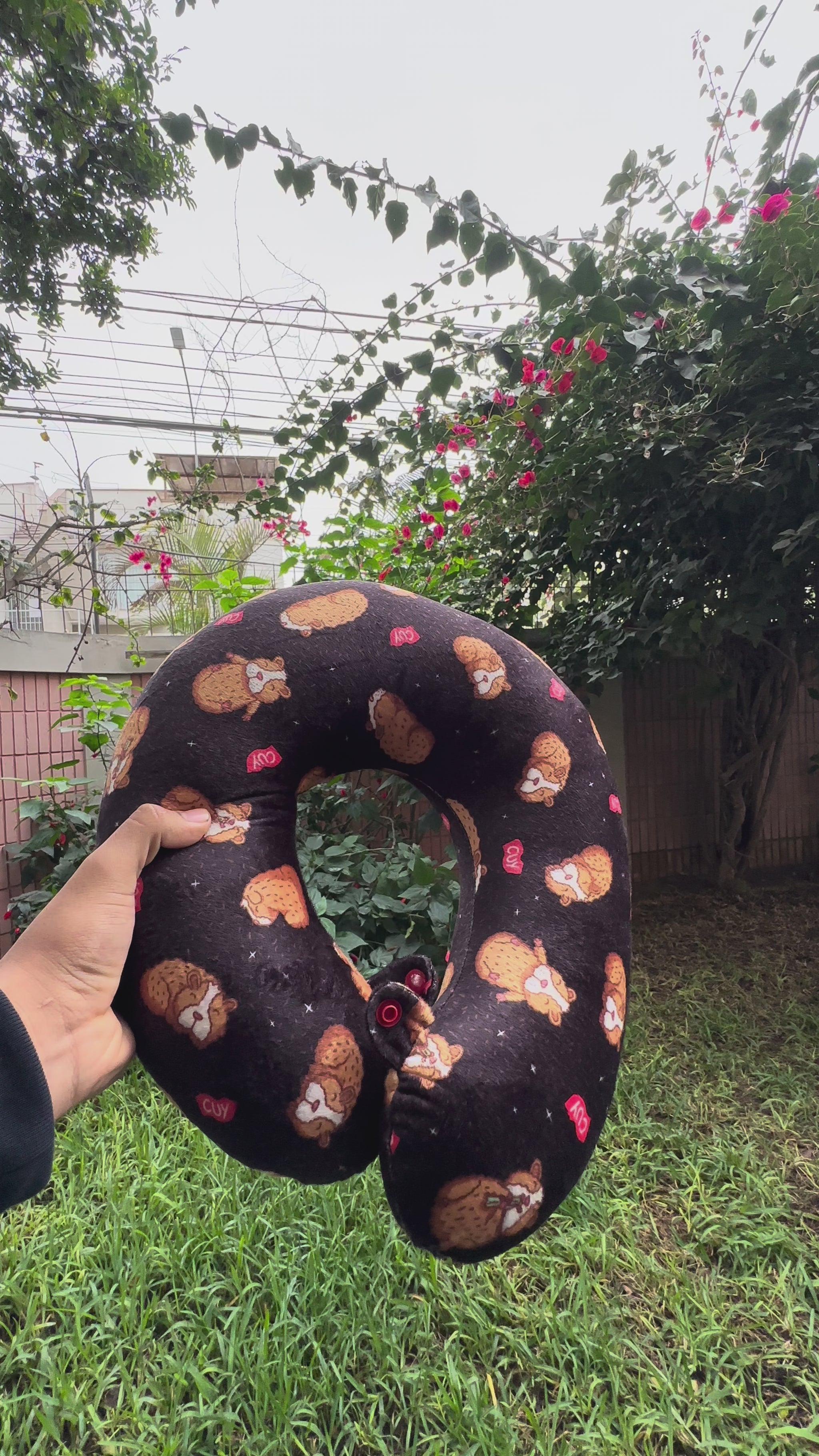Cojín U con estampado de cuyes sobre fondo negro. Perfecto para viajeros y “foodies” que aman los íconos del Perú. Ergonómico para el cuello, suave al tacto y práctico para trayectos largos o la oficina. Envíos a todo el Perú.