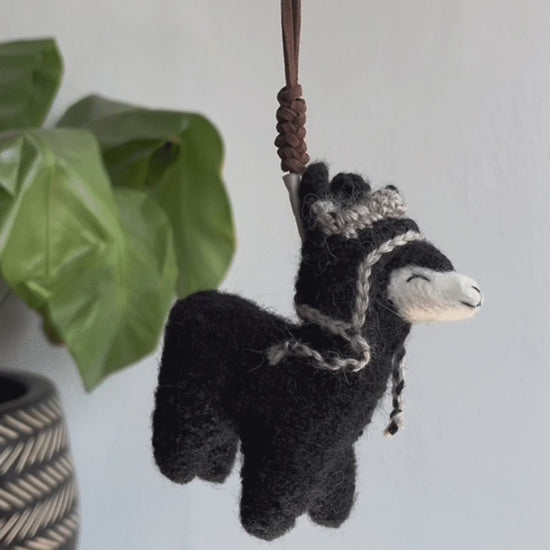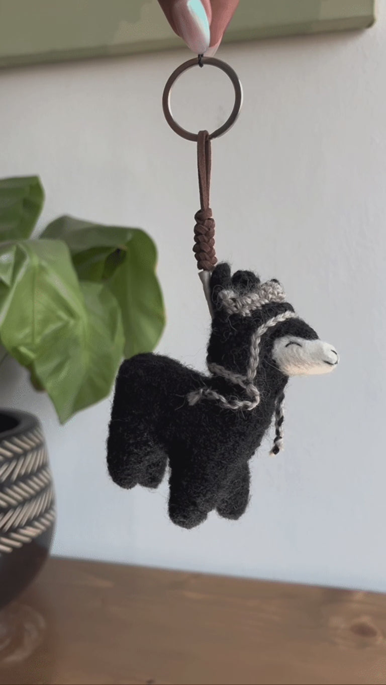 Llavero hecho de fibra de baby alpaca y cuero, diseñado en conjunto con artesanas arequipeñas y elaborado a mano por ellas.