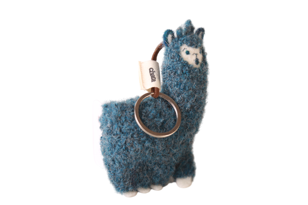 Llavero hecho de fibra de baby alpaca y cuero, diseñado en conjunto con artesanas arequipeñas y elaborado a mano por ellas.