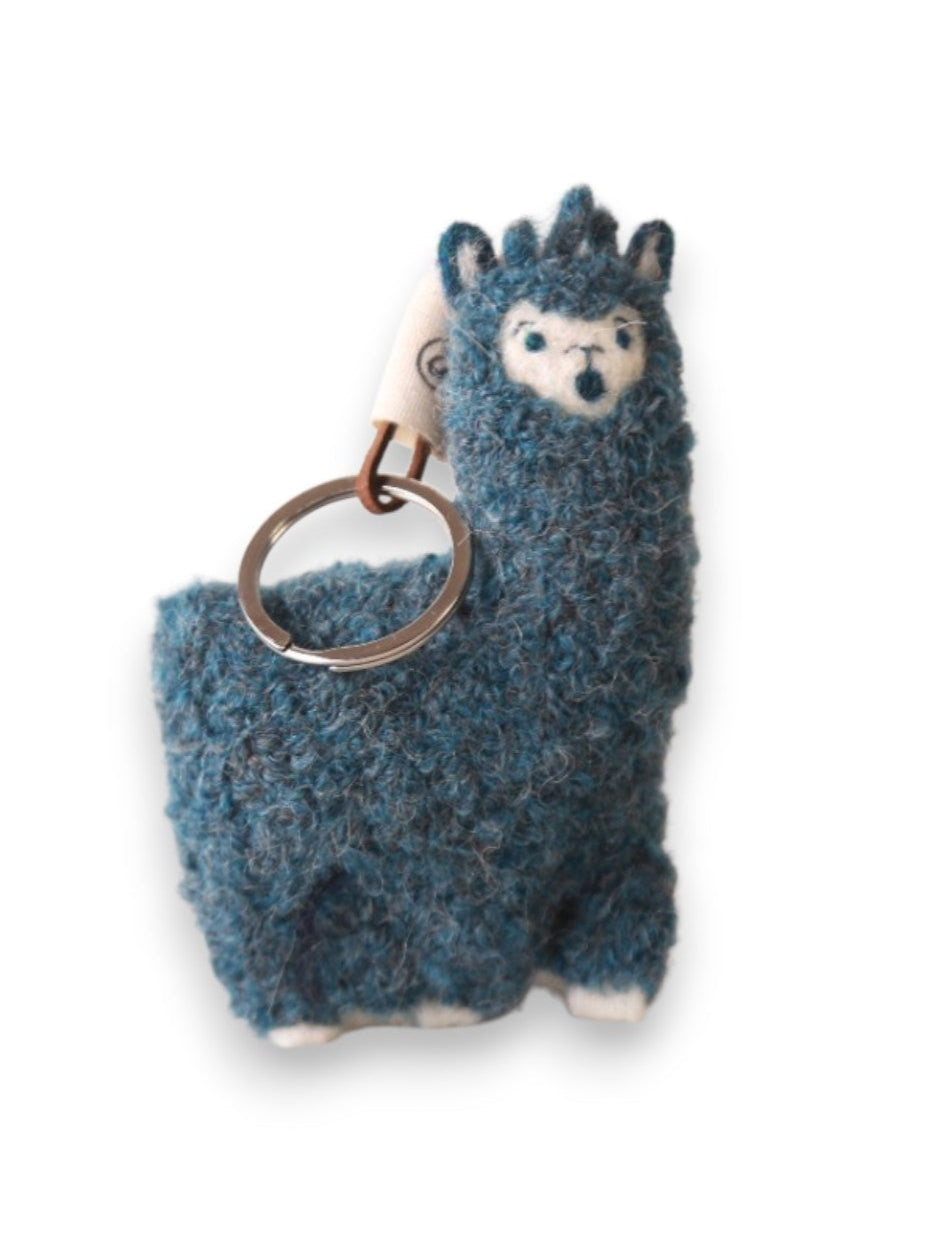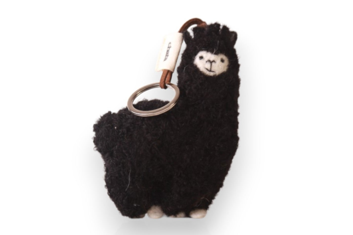 Llavero hecho de fibra de baby alpaca y cuero, diseñado en conjunto con artesanas arequipeñas y elaborado a mano por ellas.