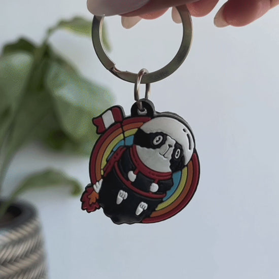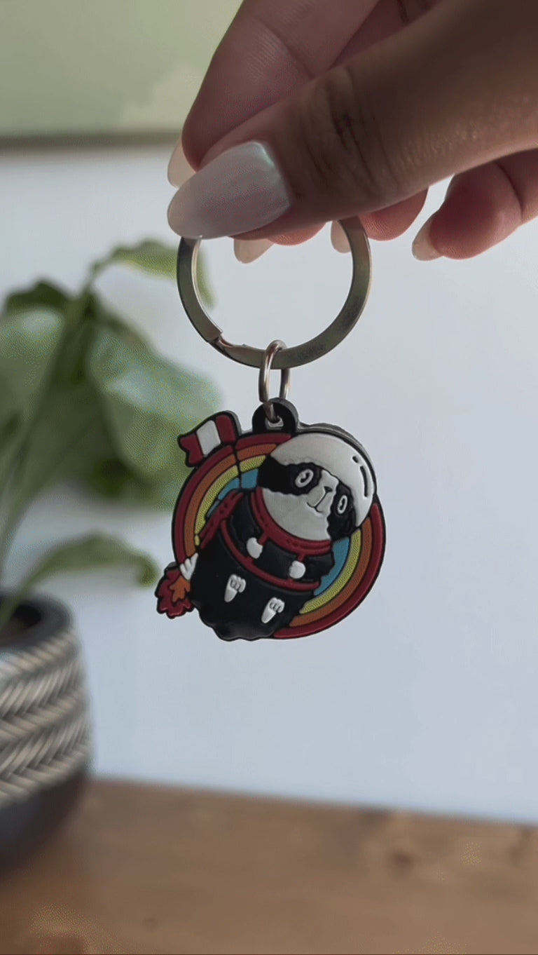 Este llavero de plástico presenta a un cuy convertido en astronauta, viajando entre planetas y arcoíris en un diseño único y llamativo. Con tonos negro, blanco y rojo que contrastan con el fondo colorido, transmite una mezcla de humor y aventura. Ligero y resistente, es perfecto para darle un toque especial a tus llaves, mochila o estuche de viaje. Más que un accesorio, es un recuerdo original del Perú con un guiño moderno y cósmico.