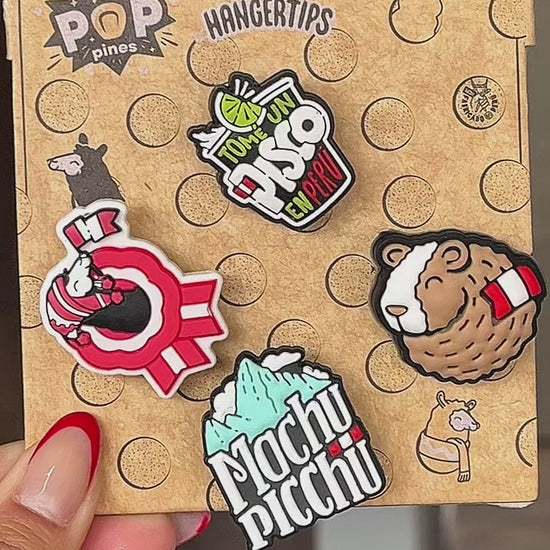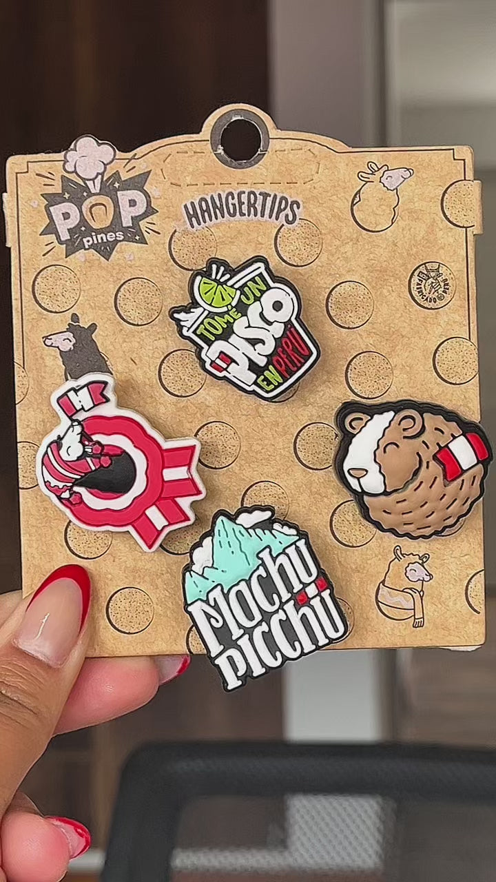 Pack de 4 Pop Pines para sandalias con agujeros. Imagen referencial de uso. Cada pack viene con diseños ya establecidos.
