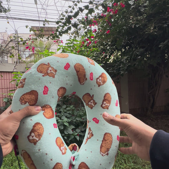 El Cojín U Cuy es un homenaje tierno al clásico cuy peruano. Su tono celeste y estampado simpático lo convierten en un accesorio alegre para viajeros de todas las edades. Funciona como soporte cervical en vuelos, roadtrips y largas esperas en aeropuertos.