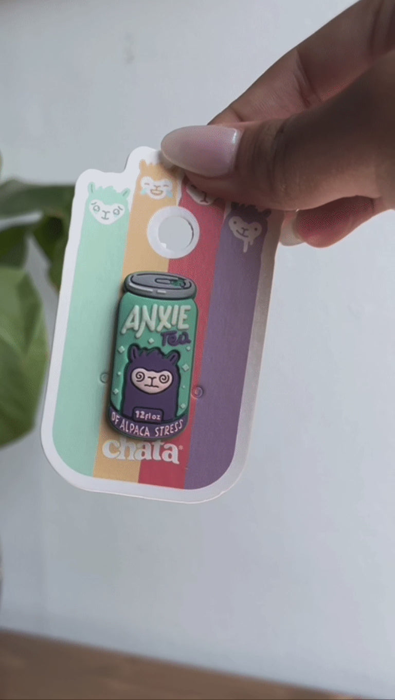 El Pin Chata Morado Lata. Con un diseño divertido de lata, es un accesorio único que mezcla tradición y modernidad con humor.